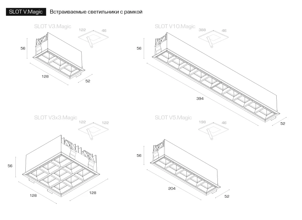 Встраиваемые светодиодные светильники Slot V x3 с декоративной рамкой. Модификации с индексом "Magic" имеют прямоугольное пятно света (асимметричное светораспределение 35°x70°).
